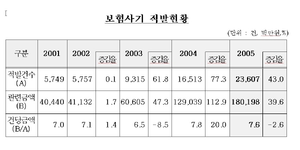 한편 지난해 보험사기 적발건수는 2만3,607건으로 전년대비 43.0%, 적발금액은 1,802억원으로 전년대비 39.6% 각각 늘었다.