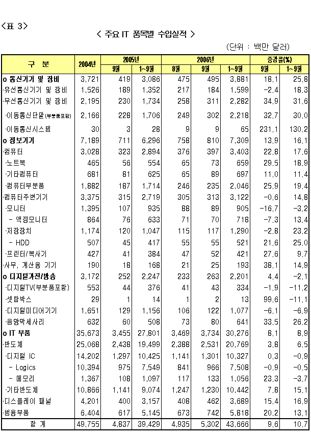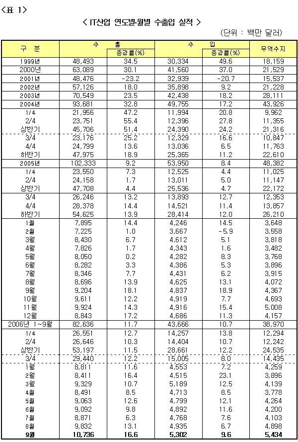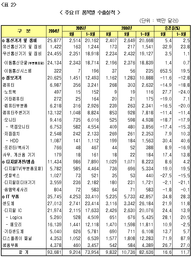 9월 IT수출은 계절적 수요의 영향 등으로 사상최초로 100억 달러를 돌파하였으며, ’06. 7월 이후 3개월 연속으로 견조한 성장세를 이어갔다.