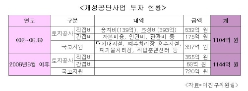 3일 한나라당 건교위 소속 이진구(충남 아산)의원은 통일부와 토지공사가 제출한 자료를 분석한 결과, 개성공단사업에 들어간 돈은 토공 투입이 ▲용지비 139억 원 ▲조성비 393억 원 ▲간접비 175억 원, 통일부의 남북협력기금 지원이 ▲2004년 26억 원 ▲2005년 173억 원 ▲올해 6월 현재 198억 원 등 모두 1104억 원인 것으로 나타났다고 밝혔다.