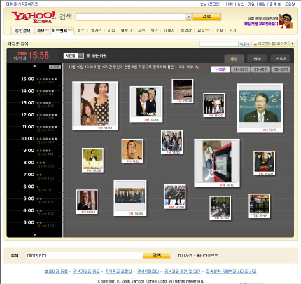 ‘타임존 검색’은 실시간 업데이트 되는 뉴스를 시간대별로 분류해 주요 이슈들을(1위~60위) 이미지컷과 함께 보여 주는 서비스다. 특히 사용자가 직접 특정 날짜와 시간을 지정하여 시간대별, 일별, 주간별, 월별 화제 뉴스를 볼 수 있는 맞춤형 서비스인 것이 특징. 즉, 사용자가 2006년 10월 9일 오전 11시~12시간대를 선택하면 그 당시의 주요 뉴스를 쉽게 파악 할 수 있다.