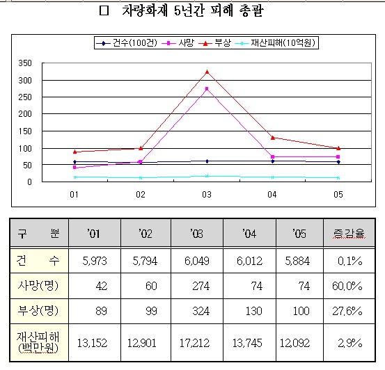 소방방재청이 최근 발행한 2005년도 화재통계연감을 분석한 결과, 지난 2001년부터 2005년까지 총 2만9,712건의 차량 화재가 일어난 것으로 나왔다.