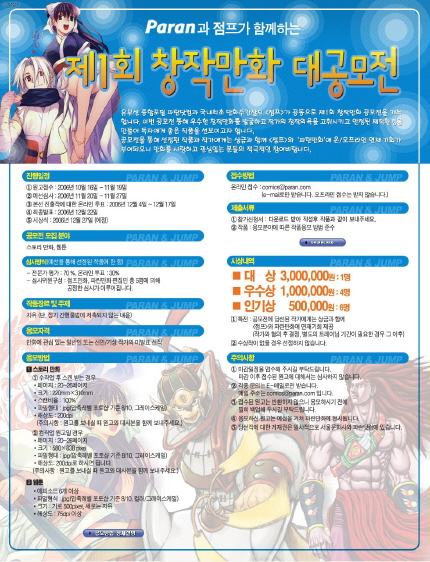 [프라임경제]KTH(대표: 송영한)의 인터넷포털 파란(www.paran.com)은 국내최초 만화주간잡지 <점프>와 공동으로 ‘제1회 창작만화 공모전’을 개최한다.