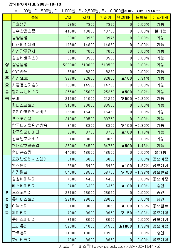 삼성생명 51만9500원, 동양생명 8975원, 금호생명 7925원을 기록하며 각각 보합을 보였다.