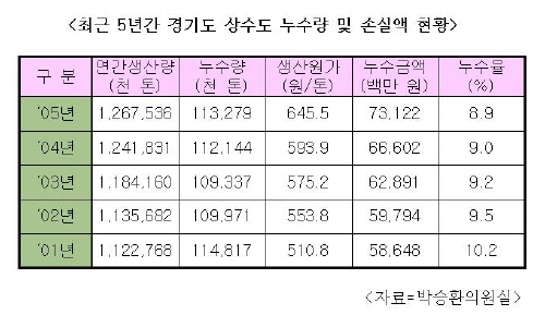 15일 국회 건교위소속 박승환 의원이 경기도로부터 받은 국감 자료를 분석한 결과, 최근 5년간 상수도 누수량 및 누수에 따른 손실액<표 참고>을 분석한 결과 누수율은 매해 줄어들고 있었지만, 누수금액은 매년 약 30억원씩 늘어 2001년 586억원에서 2005년 731억원으로 25%가 늘어난 것으로 밝혀졌다. 아무도 모르게 매년 수백억원의 세금이 새나가고 있는 것이다.
