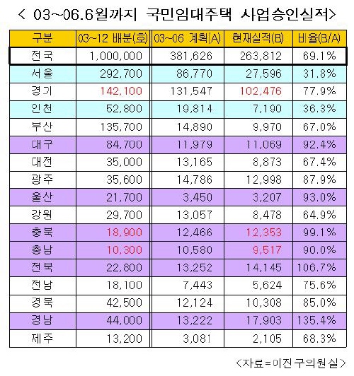 2003년 참여정부 출범이후 올해 6월말 현재까지 전국에서 사업승인을 마친 국민임대주택은 총 26만3천812호. 원래 계획 38만1천626호에 훨씬 못 미치는 69.1% 수준이다.