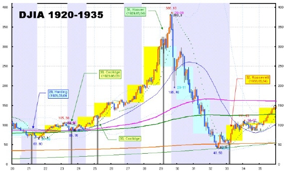 | 대공황전후 다우지수. 1929년부터 1932년까지 수직 폭락하는 모습이 보인다. | ||