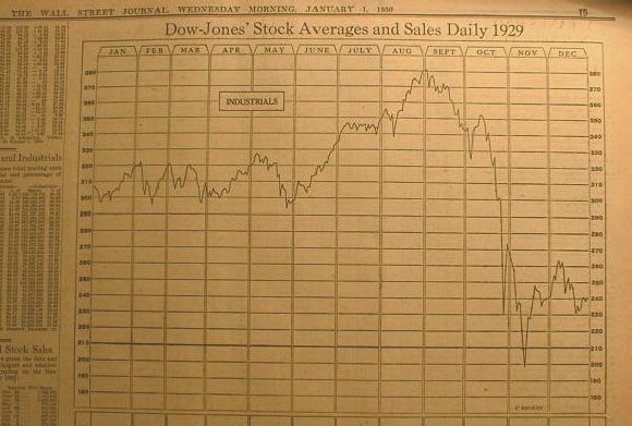 | 1930년 1월초 월스트리트 저널에 실린 1929년 다우지수 차트로 구하기 힘든 희귀본이다. | ||
