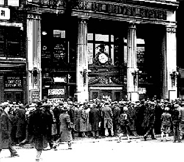 | 대공황으로 은행이 줄줄이 도산하자 예금자들이 예금을 인출하기 위해 은행앞에 모여들고 있는 모습. | ||