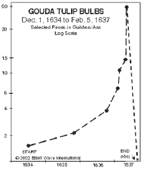| 1637년 네덜란드에선 3년만에 60배 가까이 폭등했던 튜울립 선물가가 단숨에 빠진 모습을 보여주고 있는 당시 그래프. | ||