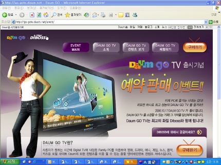 'Daum GO TV'는 17일부터 21일까지 경기도 고양시 한국국제전시장 킨텍스(KINTEX)에서 열리는 국내 최대의 전자분야 종합 전시회 '2006 한국 전자전(KES)'을 통해 첫 걸음을 내딛는다. 해당 TV 시연 및 예약 가입은 다음 內 마련된 이벤트 페이지(http://go.goto.daum.net/event/)를 통해 원스톱으로 가능하다.