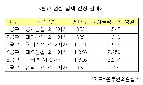 한나라당 윤두환(울산 북구)의원은 17일 주택공사 국감에서 “지난 5월 주공이 판교 아파트 6000가구에 대한 건설업체 선정 과정에 공구당 10명의 평가위원이 참여했는데, 공구마다 주택공사 직원이 3명씩, 주공의 자문위원인 교수가 1~2명씩 참여해 일부 건설사를 밀어주기 위해 담합을 한 의혹이 있다”고 주장했다.