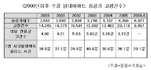 국회 건교위 소속 열린우리당 장경수(경기 안산 상록갑) 의원이 대한주택공사로부터 제출받은 ‘2000년~2006년6월말 현재 주공 전국 임대아파트 승강기 고장현황’ 국정감사 자료에 따르면, 주공 임대아파트 승강기는 2005년에만 26분마다 한대씩 고장나고 있는 것으로 밝혀졌다.