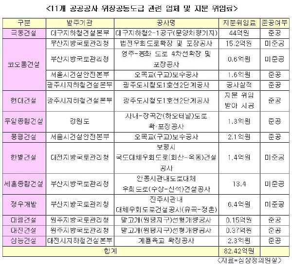 공사규모 8733억의 공공공사에 우리나라 도급순위 3위인 현대건설(주)에서부터 도급순위 19위 풍림건설(주), 20위 코오롱 건설(주), 31위 극동건설(주)에 이르는 대형건설사부터 지방의 중소 건설업체까지 11개 업체가 관련되어 있었다.(표 참고)