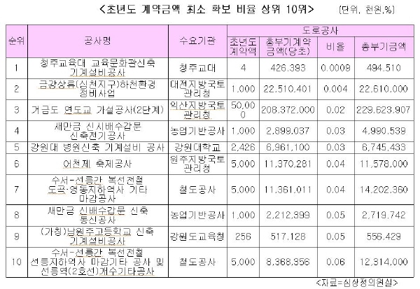 #사례2=382억짜리 ‘국도25호선 상주 내서 위험도로개량공사’ 첫 해 계약금은 0.013%인 50만원이었다. 총공사비 1270억 짜리 여주 우회도로 개설공사의 경우 첫해 계약금이 0.008%인 1000만원에 불과했다.