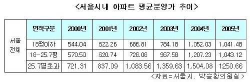 20일 서울시가 국회 건교위 소속 한나라당 박승환 의원에게 제출한 ‘서울시 연도별, 평형별 아파트 평균 분양가’ 국감자료에 따르면 서울시내 18평이하 민간 아파트의 분양가 상승률은 2000년 평당 평균 분양가 544만원에서 2005년 1041만원으로 1.9배 증가했고, 18평 초과~25.7평 아파트는 2000년 평균 570만원에서 2005년 1043만원으로 1.8배 증가했으며 25.7평 초과 아파트는 2000년 평균 721만원에 2005년 1250만원으로 1.7배 증가한 것으로 나타났다.