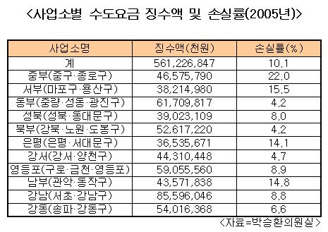 서울시가 국회 건교위 소속 한나라당 박승환의원에게 제출한 국감자료에 따르면 2005년도 수도요금 징수액은 5612억원으로, 서초·강남구를 관할하는 강남수도사업소의 징수금액이 856억원으로 가장 많고, 은평·서대문구를 관할하는 은평수도사업소가 가장 적은 365억원으로 조사되었다.