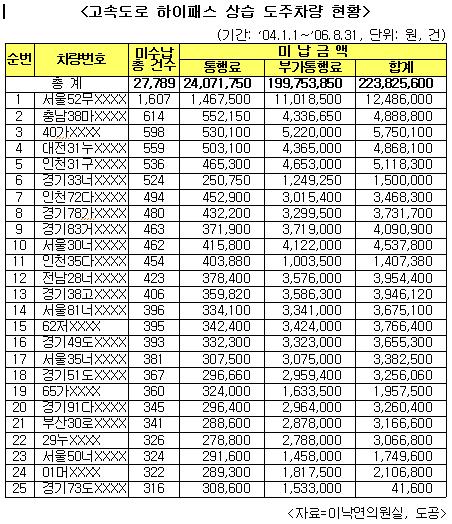 눈길을 끄는 것은 최고 1607회에 걸쳐 1248만원이나 요금을 내지 않은 상습 위반자(서울52무XXXX)까지 있었으며, 상위 100위 도주차량의 미납건수가 지난 3년간 2만7789건으로 금액으로는 2억2382만원에 달한다.(표 참고)