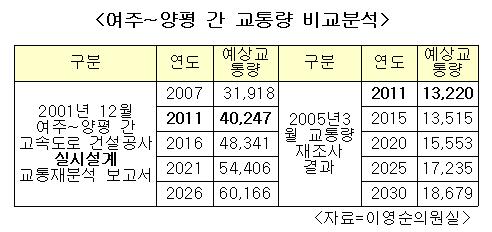 실제로 2001년 조사에서 도로공사는 여주~양평노선의 2011년 교통량이 4만247대라고 했지만, 민자 사업으로 전환되어 2005년 3월 재조사 한 결과에서는 불과 1만3220대로 3배 이상 차이가 났다(표 참고). 이 때문에 다시 국고지원 사업으로 전환되었다.