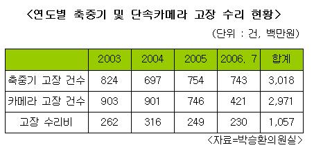 박 의원은 “2003년 이후 축중기의 경우 연평균 750건 이상 고장나고 있고, 올 상반기에만 743건의 고장을 일으켜 총 고장 건수가 3000건을 넘어섰다. 과적 단속 카메라도 매년 850건 정도의 고장을 일으켰으며 이 역시 총 고장 건수가 3000건에 육박하고 있다(03년 이후 총 2971건)”고 지적했다. 수리 비용도 2003년 이후 현재까지 10억원을 넘어섰다.