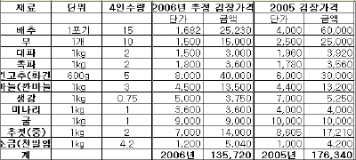 ,<표.>4인 기준 김장가격 : 2005년 / 2006년 추정금액