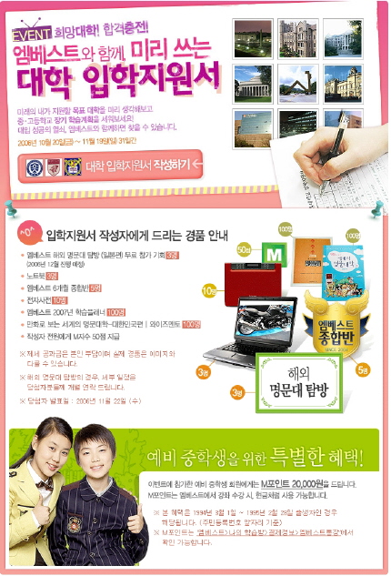 작성자 전원에게는 사이트 내에서 현금처럼 사용 가능한 M지수 50점을 증정하고, 완성도 높은 3명을 선정해 올 12월에 진행되는 일본 해외명문대 무료 탐방 기회도 제공한다. 또 노트북(3명), 엠베스트 6개월 종합반 상품권(5명), 전자사전(10명), 엠베스트 2007년 학습플래너(100명) 등도 선물로 준다.