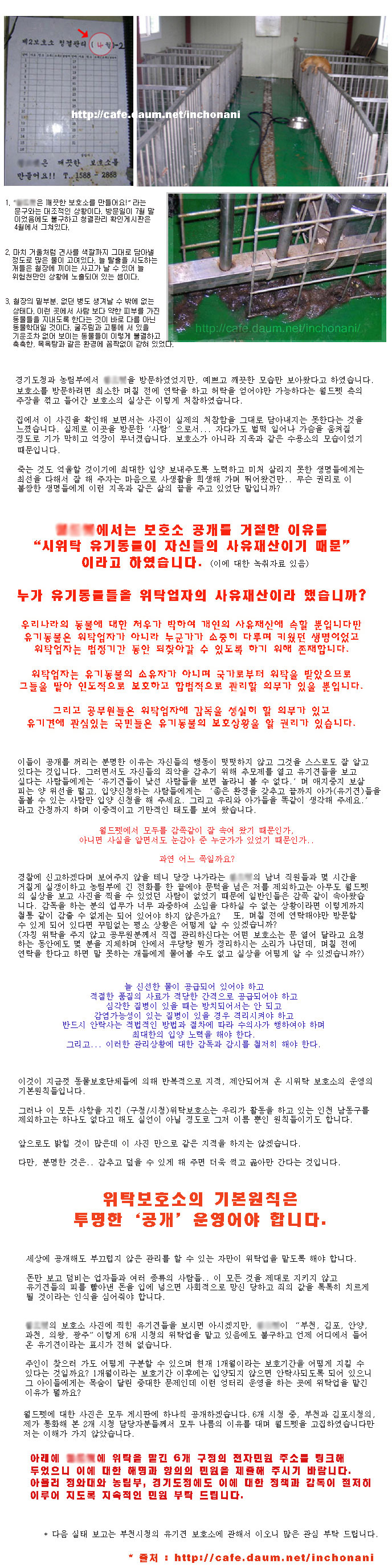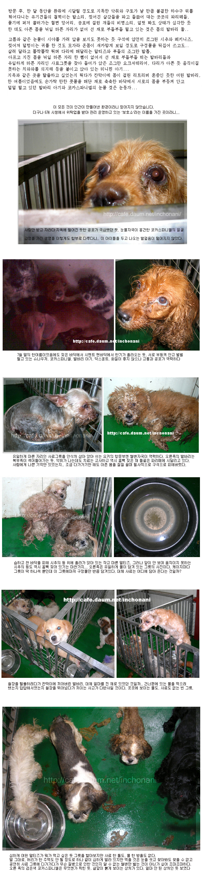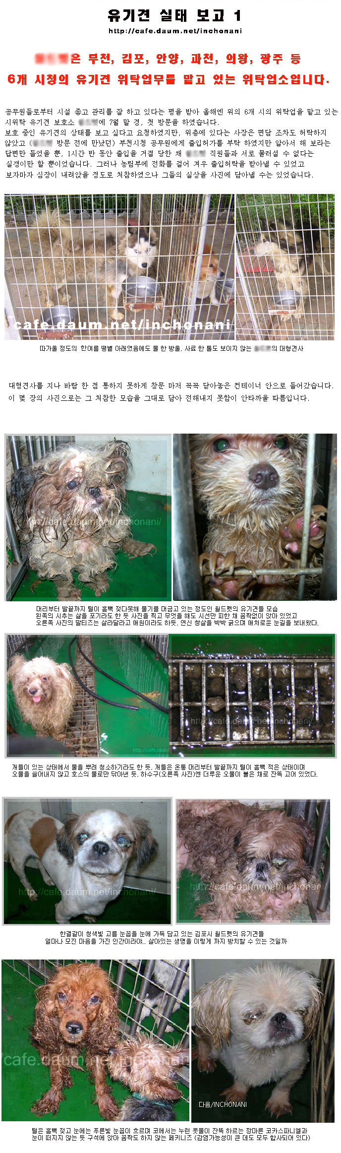 이 게시물은 동물사랑 측이 카페(http://cafe.daum.net/inchonani)에 편집 및 게재한 내용으로 지난 7월에 촬영한 것으로 확인되는 이사진은 한 네티즌이 애완견 장례까지 맡고 있는 A기업을 사전약속없이 기습방문하여 찍었다는 보호소의 내부사진.