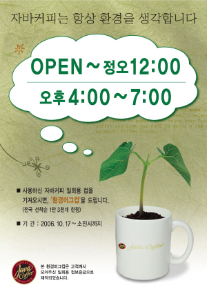 한편, 자바커피는 연간 진행되는 환경캠페인의 일환으로 ‘환경머그컵 증정행사’( 사진)를 실시한다. 개점 후부터 정오, 오후 4시부터 7시까지 자바커피의 일회용 컵을 가져오는 모든 고객에게 1만 3천개의 ‘환경머그컵’을 증정한다.