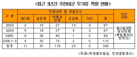 인천공항공사가 국회 건교위 소속 한나라당 박승환 의원에게 제출한 ‘주한미군에 의한 항공안전 위해물품 적발 현황’ 자료에 따르면, 인천공항에서 보안검색을 통해 적발된 탄환·총검류 등 무기류는 3년전인 2003년 57건에서 꾸준히 증가해 올해에는 8월까지만 115건이 적발된 것으로 나타났다.