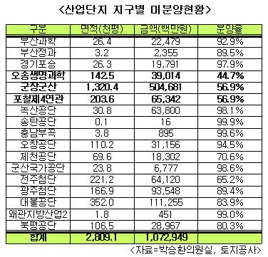 특히 군장군산단지·오송생명과학단지·포철제4연관단지 등은 전체부지의 40~60%가 미분양된 상태여서 사업 실효성에 의문을 갖게 하고 있다.