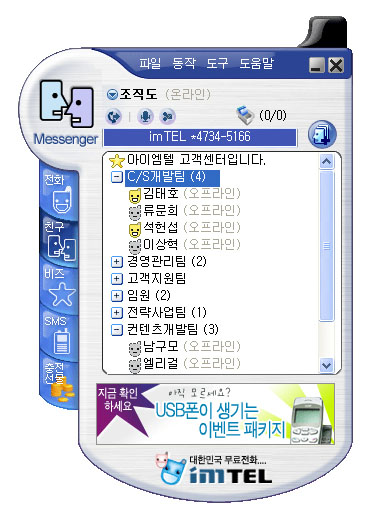 이는 기존 전화 기반의 콜센터 기능 이외에 인터넷에서의 메신저를 통하여 시간과 장소에 구애 없이 전세계 어디서든 24시간 체계적인 고객관리와 상담을 가능하게 한다. 이 서비스를 이용하는 기업은 아이엠텔 메신저 내에서 상담원과 고객과의 전화, 문자, 채팅, 쪽지 등을 통해 고객의 요청 사항 등을 신속하게 상담, 처리할 수 있다.