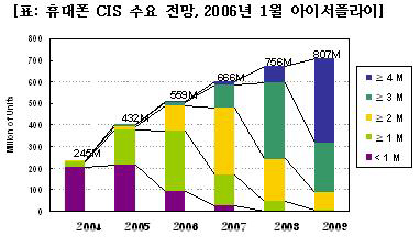 한편 시장조사기관인 아이서플라이에 따르면 200만 화소 CIS 수요는 올해 1억3000만개에서 내년 3억5000만개로 2배 이상 늘어날 것이며, 500만 화소 CIS 수요도 내년부터 서서히 증가해 2009년에는 전체 시장의 55%를 차지할 것으로 예상돼 향후 CIS 시장에서는 200만 화소급 이상 고화질 제품의 비중이 크게 확대될 것으로 전망된다.