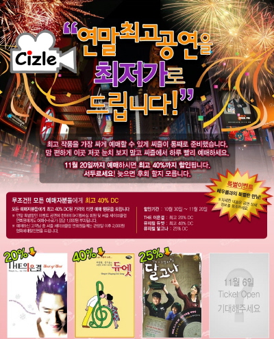 12월에 펼쳐지는 이은결의 마술쇼, 로맨틱 뮤지컬로 손꼽히는 '듀엣'과, 70∼80년대 추억의 가요를 모아 만든 뮤지컬 '달고나' 등을 오는 11월 20일까지 '씨즐' 에서 예매하면 최고 40%까지 할인해준다. 또한, 11월 6일에는 추가로 인기가수의 초대형 콘서트의 할인 예매도 개시할 예정이다. 공연이 끝나고 배우들과의 직접 만날 수 있는 시간과 싸인회 등의 특별 이벤트도 마련되어 있으며, 11월 하순경 연말 인기가수 콘서트가 추가된 2차 이벤트도 이어서 진행할 예정이다. 자세한 사항은 유무선으로 언제 어디서나 씨즐에 접속하여 확인할 수 있다.