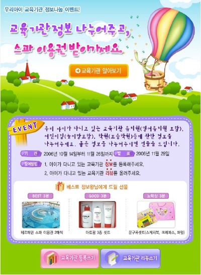 이번 이벤트는 교육기관에 대한 선배 엄마들의 생생한 정보와 리뷰를 제공해 이러한 엄마들의 고민을 덜어주고자 기획됐으며, 참여방법은 맘스쿨 이벤트 페이지에 교육기관에 대한 정보를 등록하면 된다. 각 3명씩 총 9명을 추첨해 테르메덴 스파 이용권(1인2매), 아토팜 3종 세트, 문구 세트 증정한다.