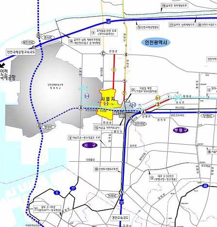 경인고속국도 서인천IC 및 국지도 98호선(서곶길)이 인접하고 경인고속국도 직선화사업(‘09년완공) 및 광로1-2호선(봉수대길)이 지구내를 통하게된다.