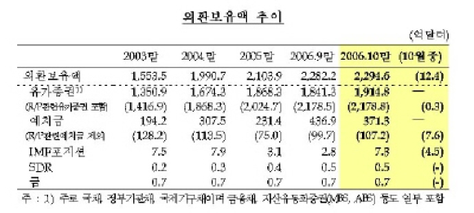 한국은행은 지난 1일 이같이 밝히고 이같은 현상을 보유외환 운용수익, 미 달러화 약세에 따른 유로화 등 기타통화 표시자산의 미 달러화 환산액이 증가 됐기 때문인 것으로 조사됐다고 밝혔다.