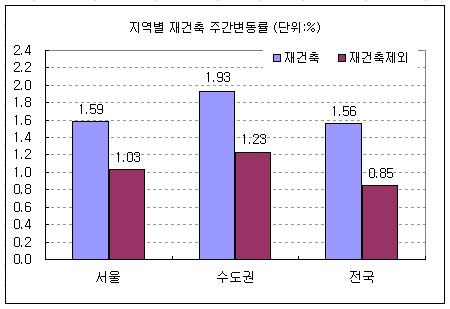 이에 따라 재건축은 한 주간 서울이 1.59%, 수도권 1.93% 상승률을 기록했다. 다만, 재건축을 제외한 일반 아파트값 상승률도 서울·수도권 모두 주간 1%대를 기록해 편차가 크지는 않았다.
