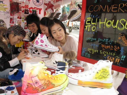[프라임경제]현대백화점 신촌점은 3일 자신의 컨버스화를 직접 튜닝 할 수 있는 튜닝 하우스를 5일까지 운영한다. 전문가가 직접 그려주기도 하고 자신이 직접 유팅 하우스에서 튜닝을 할 수 있으며, 튜닝패키지를 이용 집에서도 직접 컨버스화를 꾸밀 수 있다.