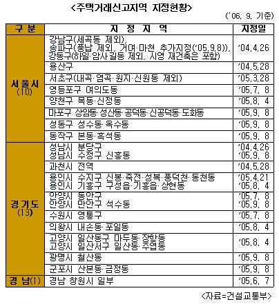 한편, 건교부는 최근 수도권 주택가격이 불안한 양상을 보이고 있는 점을 감안해 주택거래신고지역 지정요건에 해당되는 지역 중 투기 우려가 있는 지역을 주택정책심의위원회 심의 등을 거쳐 추가 지정하는 방안을 강구할 계획이다.