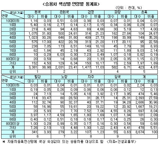 건교부는 지난 10월31일을 기준으로 전국의 등록 자동차 중 제일 많은 승용차 색을 조사한 결과 선호 색상이 흰색·은회색·검정색 계열순이었다고 7일 밝혔다.