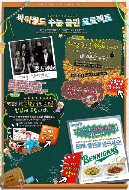 싸이월드는 또 자신의 미니홈피에 수능에 대한 의지를 담고 싶은 수험생이나, 부담되지 않는 깜찍한 수능선물을 하고 싶은 이들을 위해 '수험생 응원 스킨'을 16일까지 절반 가격에 판매한다. 베니건스와 제휴하여 베니건스 '컨츄리 치킨 샐러드' 또는 '빅마마 버거 스테이크' 50% 할인권도 증정한다.