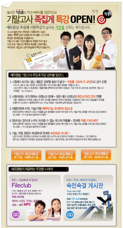 두산에듀클럽의 ‘기말고사 족집게특강’은 내신정규과정을 강의하는 강사가 기출문제풀이까지 진행함으로써 시험 적중률을 높인 단시간 집중학습프로그램이다.