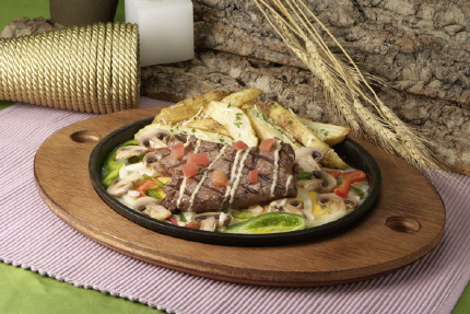 또 메인으로는 쿵파소스를 발라 구운 닭가슴살에 양송이밥을 곁들여 먹을 수 있는 칠리페퍼치킨(15,900원)과 위스콘신 체다 파스타(17,500원), 케이준 쉬림프 앤 치킨 파스타(16,900원), 그리고 시즐링 치즈 스테이크 서로인(25,900원 사진)과 잭다니엘 치킨 & 쉬림프(15,900원)도 맛볼 수 있다.