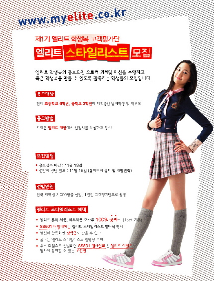 선정된 ‘엘리트 스타일리스트’는 1년간 고객평가단으로 활동하면서 각종 과제 및 미션을 수행, 엘리트학생복에 대한 평가 및 개선해야 할 점 등에 대해서 의견을 개진하고 동, 하복 교복과 전속모델인 SS501과 함께하는 발대식 참여 기회 및 장학금 지급 등 다양한 혜택을 제공받는다.