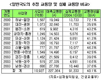 [프라임경제] 건설교통부가 상시교통량조사를 실시하고 있는 국도대체우회도로 4곳의 평균 실제교통량이 애초 예측교통량의 45.5% 수준밖에 되지 않는 것으로 밝혀졌다. 또 일반국도 중 11곳의 평균 실제교통량 역시 예측교통량의 40.1%에 불과한 것으로 드러났다.