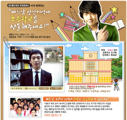 11월 13일부터 다음 달 1일까지 진행되는 이번 베트남 ‘트라미’ 지역 초등학교 짓기 후원 캠페인에는 최고의 인기연예인 ‘비’도 함께 한다. 이를 위해 자필싸인CD와 함께 모자, 목걸이, 무대의상 등의 애장품을 후원용 경품으로 쾌척했다. 싸이월드는 도토리를 후원한 싸이월드 회원을 추첨하여 비의 애장품 및 미니홈피장식고리 1,000개 등을 감사의 선물로 증정할 예정이다.
