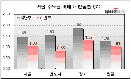 스피드뱅크(www.speedbank.co.kr)에 따르면 서울·수도권 아파트의 주간(11월12일~11월18일) 매매가격 변동률이 서울 1.03%, 신도시 0.83%, 경기 1.32%, 인천 1.03%로 한 주전에 비해 오름폭이 둔화된 것으로 나타났다.