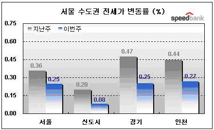 인천(0.27%), 서울(0.25%), 경기(0.25%), 신도시(0.08%) 순으로, 오름폭이 눈에 띄게 줄어든 것으로 나타났다.