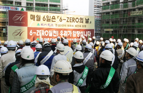 이를 위해 지난 17일 잠실 3단지아파트 현장과 김포 고촌 힐스테이트 현장에서 ‘안전을 생활화하여 무재해를 달성하자’, ‘완벽한 시공으로 최고 품질 구현하자’, ‘고객우선 생활화로 고객만족 앞당기자’ 등 6개 항목의 ‘6-Zero’ 선서에 이어 포스터·뱃지·마우스패드와 같은 홍보물을 배포하기도 했다.