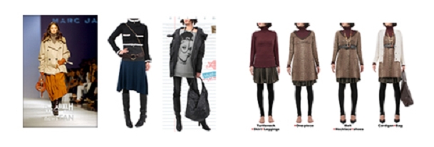 니트에 타이트한 블랙 스키니진이나, 짧은 미니스커트를 입고 레깅스를 곁들이는 방법도 있다. 이때 미니스커트는 A라인이나 H라인의 스커트가