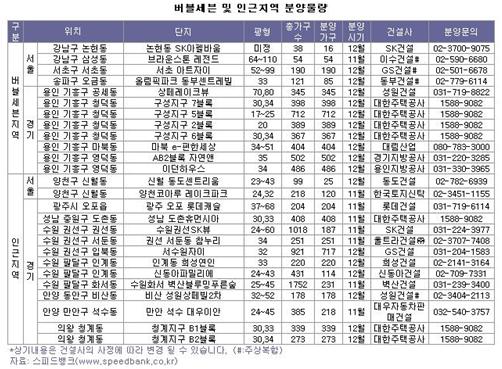 올 연말까지 버블세븐 지역에서는 강남·서초·송파를 비롯해 용인 흥덕 등에서 총 4007가구 중 3970가구가 공급될 계획이다. 성남 도촌, 의왕 청계 등 버블세븐 인근지역에서도 6916가구 중 3630가구가 일반분양 된다.
